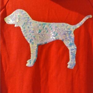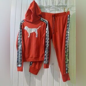 NWOT and no defects at all. Vs pink bling set no longer sold in stores. Large hoodie(armpit to armpit is 22" and centerback length is 23 1/2'). Joggers are an X-largelflat waist 18 1/2" and inseam 27"). Red with a small and large iridescent bling dog on hoodie and lots of silver bling and writeout on both pieces. Never worn and price firm.