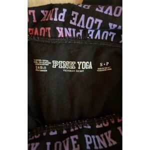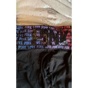 VS pink size small yoga leggings with the fold over waistband D’s are a rainbow bling in rainbow it says love pink going across it multiple times in a graduated pattern The back is the same pattern and then black sequin bling says pink he’s in really good condition no rips stains etc. the black honestly still looks like new and if you have any questions please feel free to message me these are hard to find style and will definitely go quick