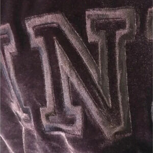 Like new with no signs of wear. Size X-small VS. PINK velour short sleeve top (armpit to armpit is 17” and center back length is 20 1/2” so it is a shorter length.). It will hit about the waist but lifting arms will probably show a little belly. Deep burgundy with embroidered writeout on front.           Tote 6.