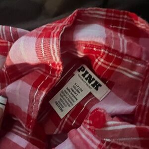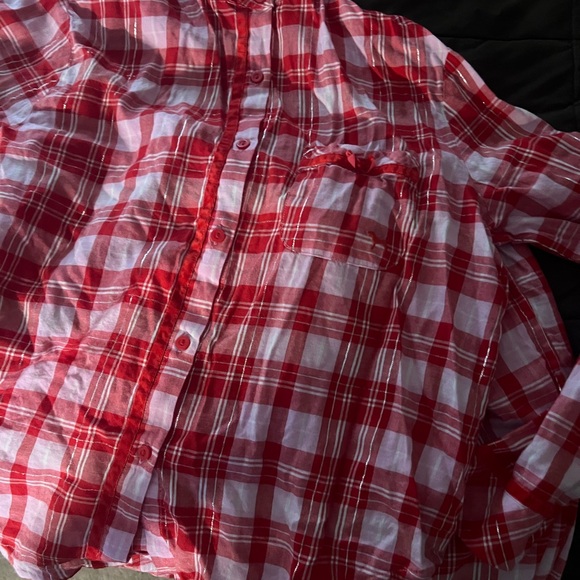 Lightweight plaid button-down shirt for girls. Features a chest pocket and full button front. Soft woven fabric for everyday wear. Classic red and white plaid pattern for versatile styling.