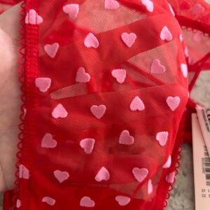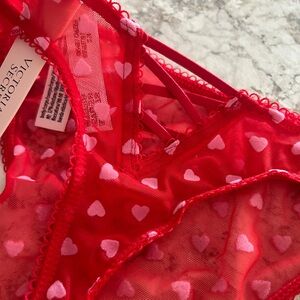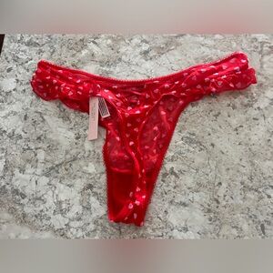 New with tags. Victoria’s Secret Valentine’s day panty. Size large. High thong style. Red with pink heart design. Cross back with ruffle sides. Pet free, smoke free home.