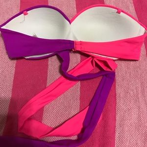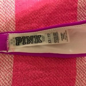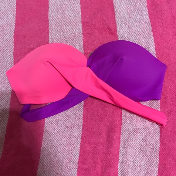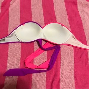 This VS PINK Bandeau has only been twice. Has ribbons that are tied in the back (as seen in pictures). Push-up. Size: Extra Small. 80% Polyamide. 20% Elastane. Colors: pink & purple.
