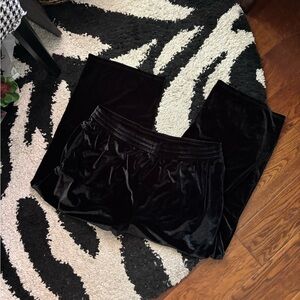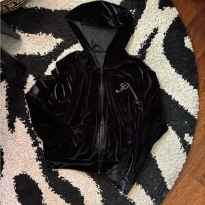 Great used condition. Brand/size tags have been cut off. Black velour sweatsuit set with hoodie and sweatpants. Rhinestone branding detail across the pants. Size XXL.