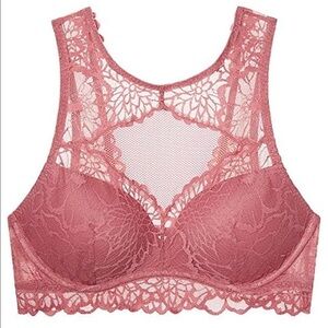 Victoria's Secret Pink Floral Lace High Neck Push-up Bralette (Soft Begonia) condition: great condition! no damages or flaws All about that lace. New full on floral lace meets the perfect amount of push in this showoff bralette. Pair it with high-waisted bottoms and rock it ... SIZE: L/ DD