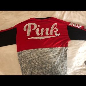 VS Pink brand Red/black/grey collegiate style long sleeved shirt with sequin logo detailing.