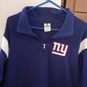 Get game-day ready with VS Pink NY Giants long-sleeve jersey! Gently worn, pull-over style, NY Giants colors and sequin logo adds style and chic class! Signature dog logo on front and Metallic Red NY Giants Football logo on back. Game on!!!