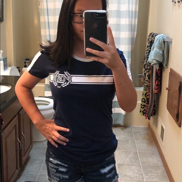 Dark blue VS Pink ringer tee. Big white stripe across chest with Pink in an emblem. Shirt is a little tight but not skin tight (just a warning). No stains or faults in it. Comment any questions or concerns with this. Bundle with other items in my closet for a discount! Make offers!