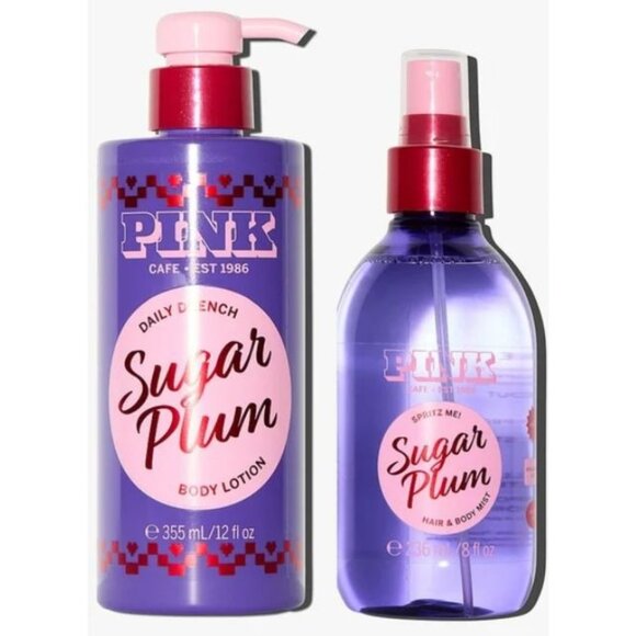 This set includes a hydrating body lotion and a refreshing mist with a sweet sugar plum fragrance. Ideal for daily care and scent layering.