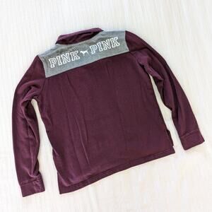 Victoria's Secret Pink burgandy and gray pull over quarter zip sweater. 1/4 zip, collared, front pocket. Gray block upper and burgundy bottom.