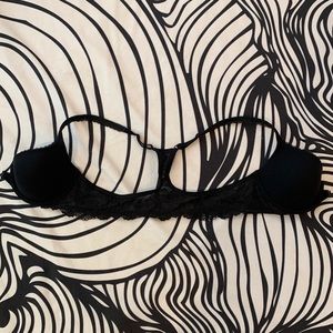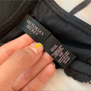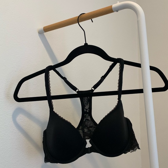 Victoria’s Secret racerback demi bra in black. size 34B. has been worn but still lots of wear left; in good condition (some fuzz). floral lace for the racerback part. no band adjustment, bra unclips in the front (see pics 3&4). let me know if you have any questions:)
