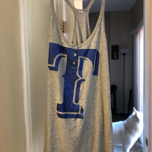 Grey tank with metallic blue “T”. tag is removed, but it’s a size Large.