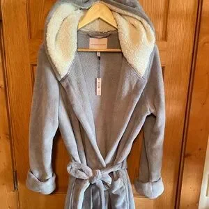 NWT super soft robe, with tie, pockets, and hood! Light grey with Sherpa accents!