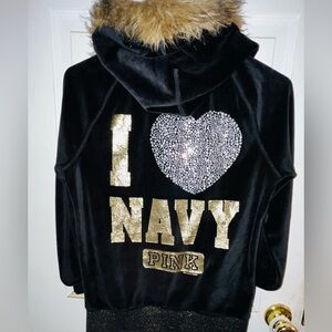 Chic RARE hoodie with 'I Love Navy' design. Crafted by PINK Victoria's Secret. Black with gold accents. All rhinestones in place. The gold crackling design was made that way. The fur hood is perfect. The hoodie is in absolute perfect condition. It’s beautiful! Part of the I love the Navy sets. You won’t find this hoodie anywhere. It’s super hard to find. And especially in perfect condition.