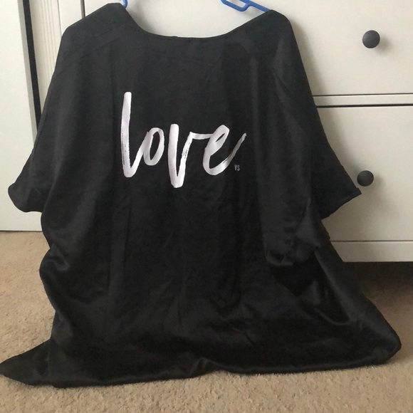 Totally luxe, black, short sleeved, satin robe with « Love » written in white script on the back. A cozy piece for summer lounging ! New without tags! Parting with this gorgeous piece because I’m cleaning out my closet and making room for pieces I wear more often...just not a robe person I guess. Hope this beautiful piece finds a good home!