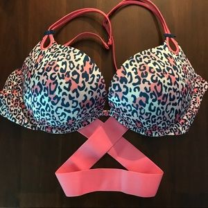 Sexy little things bra by Victoria's Secret. Worn once. In sexy pink leopard print. Convertible multi-way bra, can be worn regular, racerback, one-strap, and halter, with or without the low back extender strap. Super versatile bra for no-show under tops of all types. Extremely comfortable, in excellent condition! Size 34DD