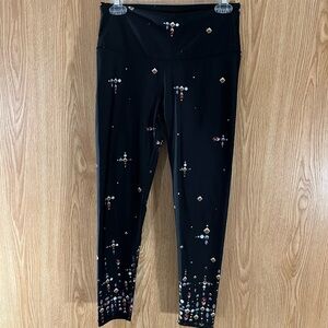 These fun leggings are in great condition. They are dark black with big jewels for a bedazzled appearance. These run a bit small and may better fit a size small.