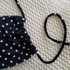 Cute polka dot bikini top from Victoria's Secret. Can be worn as a halter or bandeau, and the sides of the cups can be adjusted for more or less coverage. Comes with removable padding.