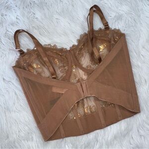 So gorgeous! Brand new with tags, and no flaws. Underwire. Can be worn as lingerie or a top. Night in, or night out! Tan nude color adorned with gold sequins. Sheer. The back design is both comfortable and flattering. Straps are adjustable and can be removed.