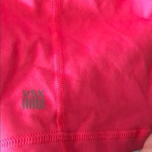 Hot pinkVictoria Secret X sport. Just at or below the knee. Thick waist band.