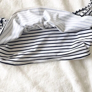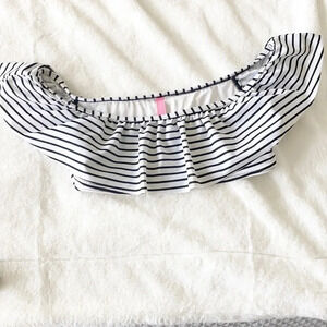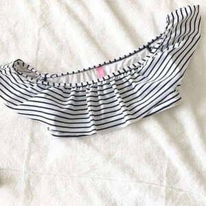 Black and white stripe bikini/swim top. Off shoulder. Ruffle details. Pull over styling. No padding. Very comfy. No flaws. Pair with black bottoms and you’re set.