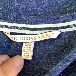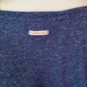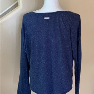 Preowned in good condition. Blue and with marled v neck long sleeve tee with silver foil writing on a black shadow
