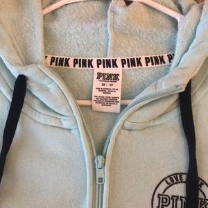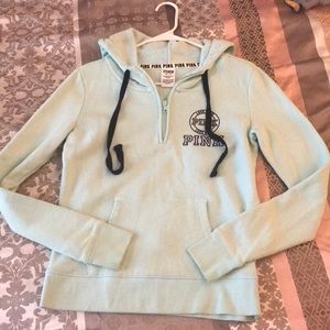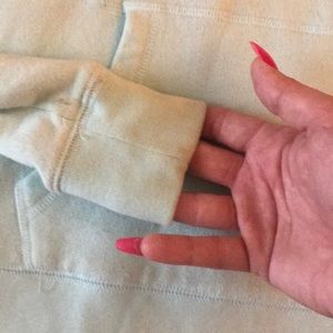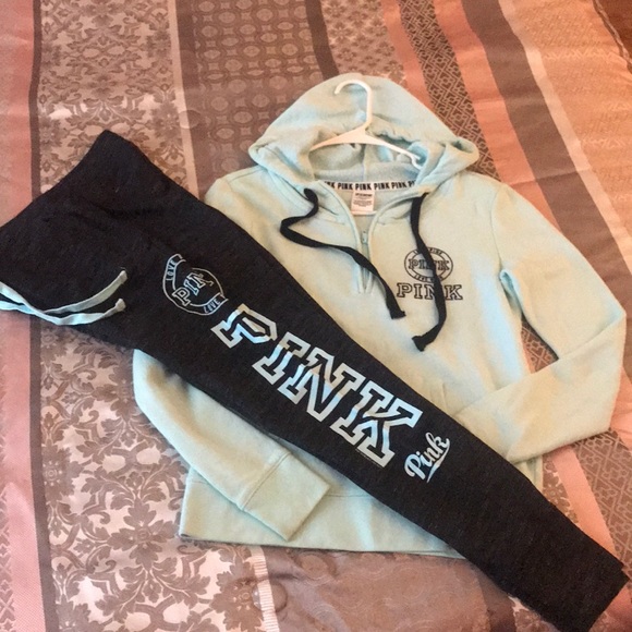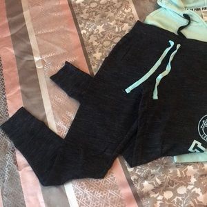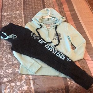 Minty light blue colored set, quarter zip hoodie, worn twice, pics of minor flaws on the sleeves and not very noticeable.. both XS.. cotton joggers wore once no flaws, like new!!