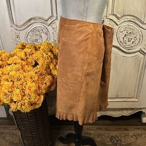 VS2 100% Camel GOAT Suede Ruffled Hem Cowgirl Boho Prairie Peasant Skirt S/12 Fully lined Bandless Soft hand feel Vintage Measurements Waist 17 inches flat Hips 21 inches flat Length 20 1/2 inches B#S