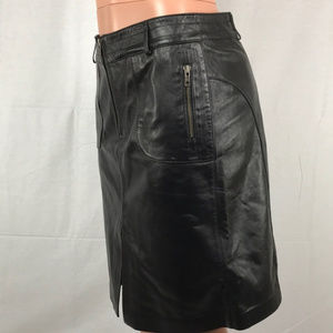 Two front slash zipped pockets. Zipper front closure and a 7" front slit. Pre-owned but in PRISTINE condition. Great for casual time at the movies or dressed up for a night out on town. Wear with heels, bilker shoes, flats, or sneakers. Can Be Worn With Anything and With Any Item/Color Palette. Whatever Fits Your Style or Your Mood! Depending on height: Knee Length. 100% Lamb Leather. Excellent Pre Owned Condition; Barely Worn.