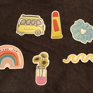 New! High quality waterproof stickers for the VSCO girl in your life! Perfect for her hydro flask, laptop, bag, car, and MANY other uses. Adorable and easy to apply. Peel and stick. Great colors not homemade. Professionally made. Do you need a hydro flask? Just comment us and we can talk about a great deal on solids or ombré ones. Other stickers available in our closet. You get the 6 stickers shown in the cover photo. The other photo is to show what’s available Other listings: Brandy Melville