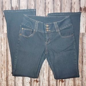 These dark blue jeans are great for heals and boots. There back pockets are designed with lines and buttons. There also wide leg jeans. In great condition, worn a few times. Junior's size 13 (Junior).
