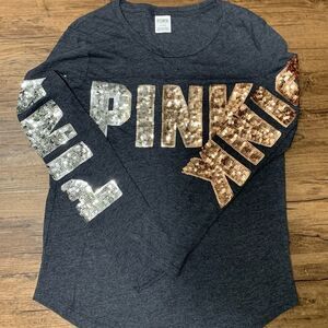 The blue dots are reflection from the camera Long sleeve campus shirt : M oversized Has ombré bling sequins bling on sleeves and front in shades of silver , rose gold and gold. So many sparkling sparkly sparkles Great condition Yoga leggings:M Great condition Has baby pink shimmer waistband Exactly matching bling at the ankles This set is a must for any bling lover. Checkout my closet for many more casual and bling sets from pink and Victoria’s Secret.. Follow me for more to come ❤️ BTRH