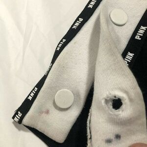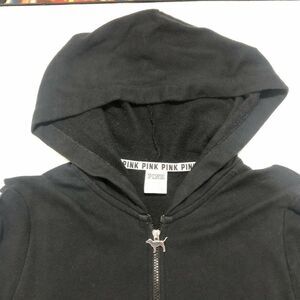 VS PINK Snap Sleeve Perfect Full Zip Hoodie. Pink logo taping along arms. Unique snap buttons on going down sleeves. Drawstrings are missing. Gently preowned; no major rips or holes. Does have marker spots at the end of one sleeve. First button closet to wrist on left side, button is loose not attached to Sleeve. Also, top of pocket, stitching is coming undone; See pics. Still, a super cute unique hoodie with VS dog as a zipper pull!