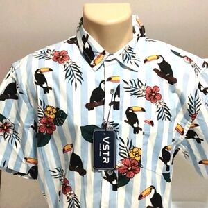 VSTR BLUE WHITE STRIPE TOUCAN CASUAL SHORT SLEEVE BUTTON UP SHIRT SIZE L…