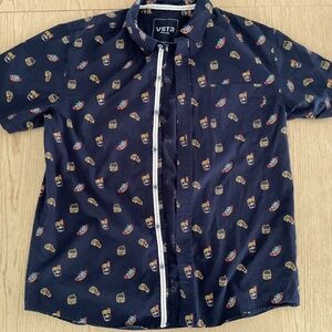 The VSTR Fun Foodie Shirt is a novelty button-up shirt in size Large, featuring a colorful design with pizza, hot dog, fries, and hamburger accents. Made of cotton, this summer-themed shirt is perfect for casual occasions like travel, parties, or everyday wear. The short sleeve, front pocket, and regular fit make it comfortable for all-day wear, while the button closure adds a stylish touch to the overall look. Ideal for men who love foodie themes, this shirt is a fun and eye-catching addition to any wardrobe.