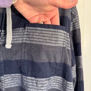 VSTR Men's Navy and Gray Striped Hooded Button Up Sweater 100% Cotton Size XL