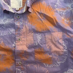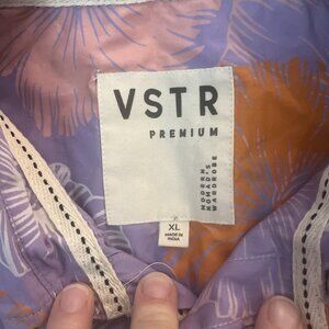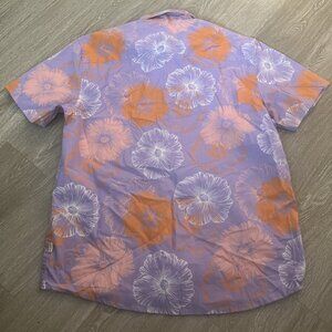 VSTR Mens Size XL 100% Cotton Button Down Casual Purple Hawaiian Floral All over Print Hibiscus Purple Orange Cruise Beach Vacation Island Vibes College Spring Break