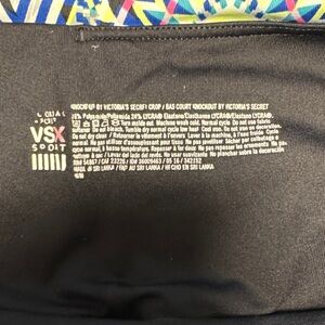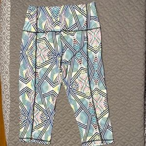 Vibrant leggings with a geometric pattern. Features a mix of blue, pink, and yellow colors.