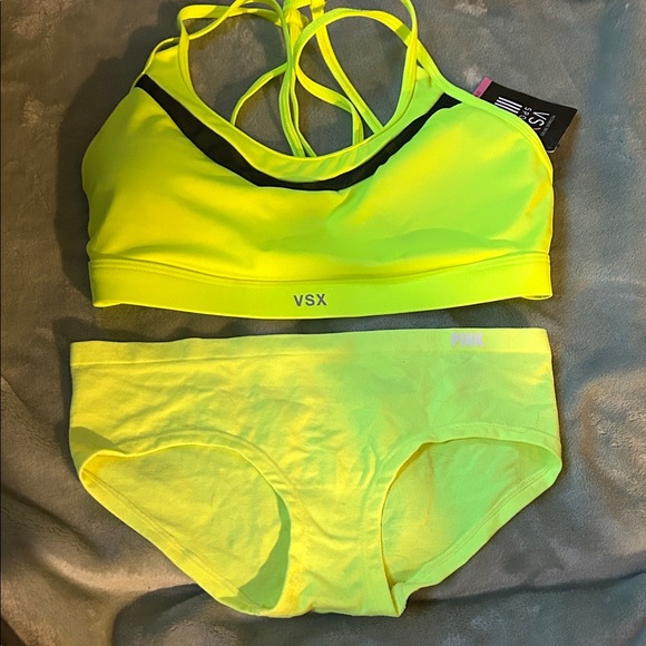 Neon yellow sports bra and undies set. Stored in basement. Tags attached.