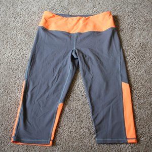 Gray Orange Capri leggings made by VSX Sport by Victoria's Secret. They are in great used condition. They are a women's size Small. They measure 25" long with a 16.5" inseam(measurements are with them laying flat unstretched). Fabric is stretchy - 77% nylon and 23% lycra.