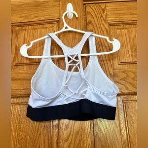 Stay comfortable and stylish with this women's sports bra. Featuring a sleek white design with a contrasting black band, it is perfect for any workout. Enjoy the support and style you need.