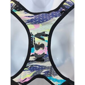 Well loved Victoria's Secret Sports Bra. Racerback design, mesh sides for breathability, back clasp has 3 adjustments, maximum support. Unfortunately the tags have been removed but does fit a size 34D. The lettering in the graphics on the back piece have come unglued on the edges (see images).