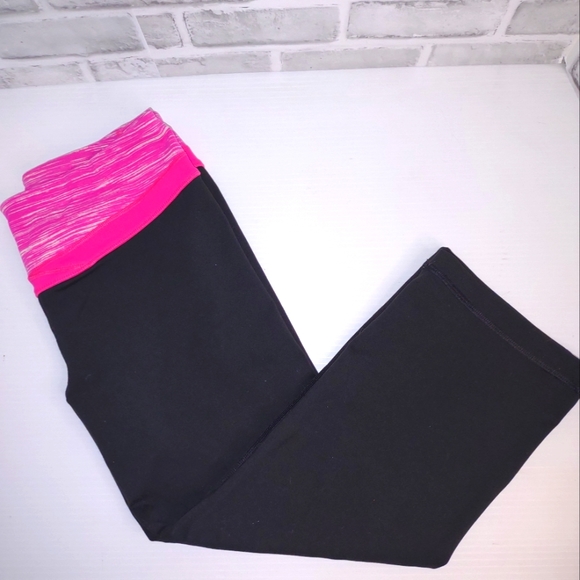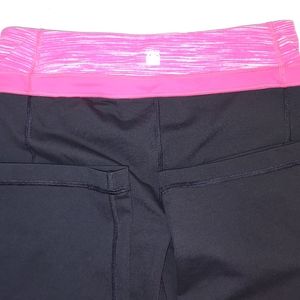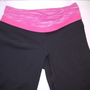Black Capri with a wide pink waistband. Thin pink band, wide pink/white band. Has small pocket.