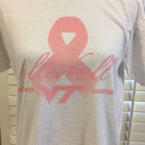 This is a Virginia Tech breast cancer awareness volleyball tee. It is pink and white in color and is in good condition.