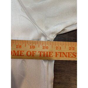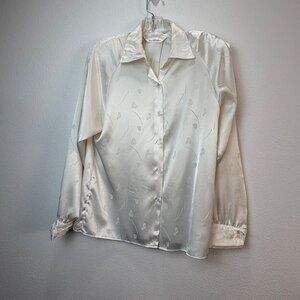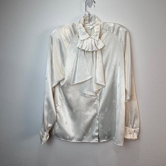 This blouse offers a sophisticated design with a delicate floral pattern and a luxurious satin finish. The ruffled collar adds a touch of elegance, making it an excellent wardrobe staple for professional or formal settings. No size tag - please check measurements below or in photos to ensure fit