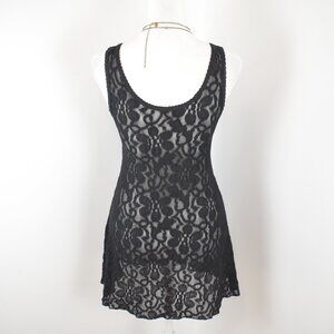 VTG 00s Y2K Black Floral Sheer Mesh Lace Scoop Neck Babydoll Slip Tank Top Sz M