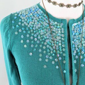 VTG 00s Y2K Gap Teal Blue Knit Sequin Beaded Long Sleeve Hook Eye Cardigan Sz XS