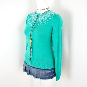 Vintage Mid 2000s Y2K Teal Blue Knit Sequins Beaded Shoulder Detailing Long Sleeve Hook & Eye Closure Cardigan Size XS