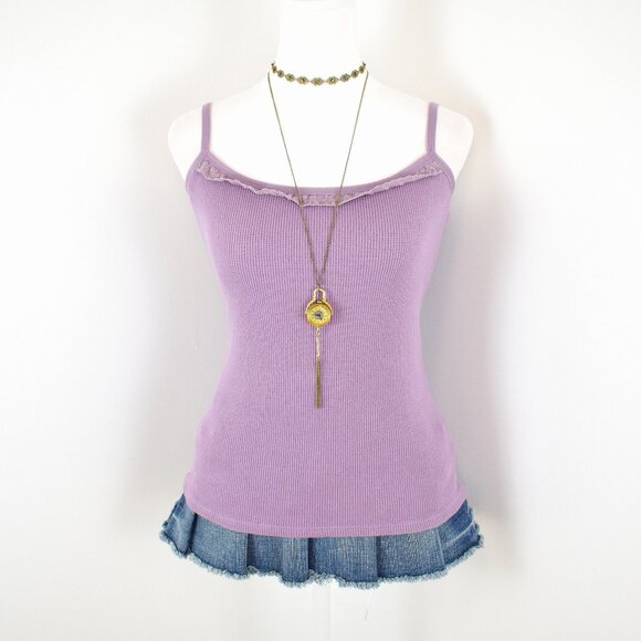 Vintage 2000s Y2K Lilac Purple Ruffle Floral Lace Trim Built-In Bra Waffle Thermal Knit Spaghetti Strap Cami Top Size Medium