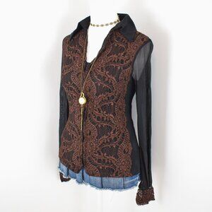 VTG 00s Y2K Kay Celine Black Sheer Mesh Brown Floral Lace Long Sleeve Zip Blouse