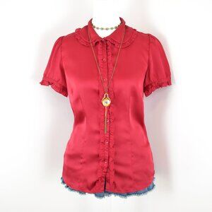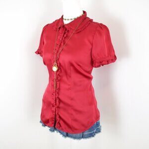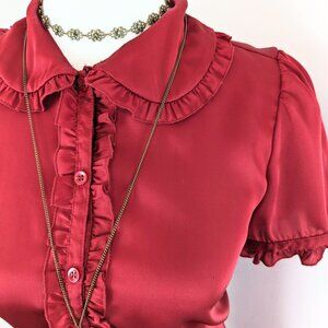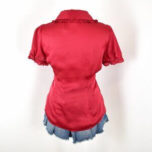 VTG 00s Y2K LOFT Red Satin Ruffle Trim Peter Pan Collar Button Up Blouse Sz 0